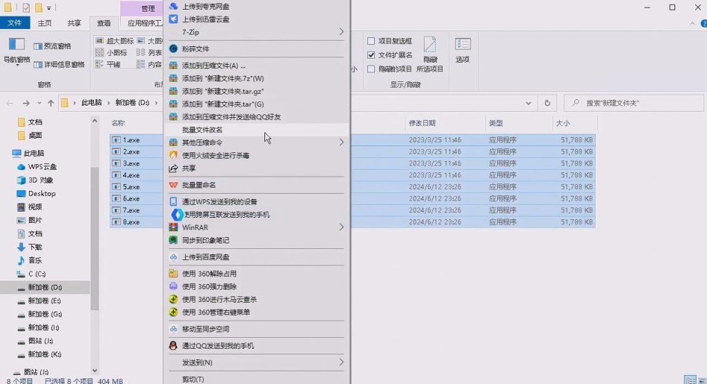 ①选中需要批量修改后缀名的资源,然后右键选择批量文件改名【前提需要电脑先安装2345好压】